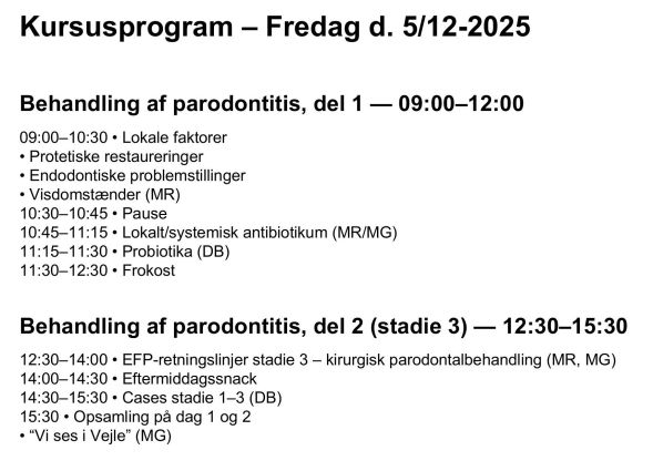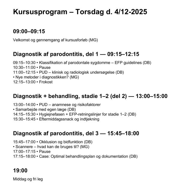 Denne efteruddannelse er for dig, der ønsker at udvikle og styrke dine kompetencer inden for diagnosticering, behandlingsplanlægning og behandling af patienter med parodontal sygdom. Du opnår faglige kompetencer i de indledende faser af behandlingen – fra undersøgelse, klassifikation og diagnostik til behandlingsplanlægning, prognostiske overvejelser samt selve behandlingen af parodontale og peri-implantære sygdomme.